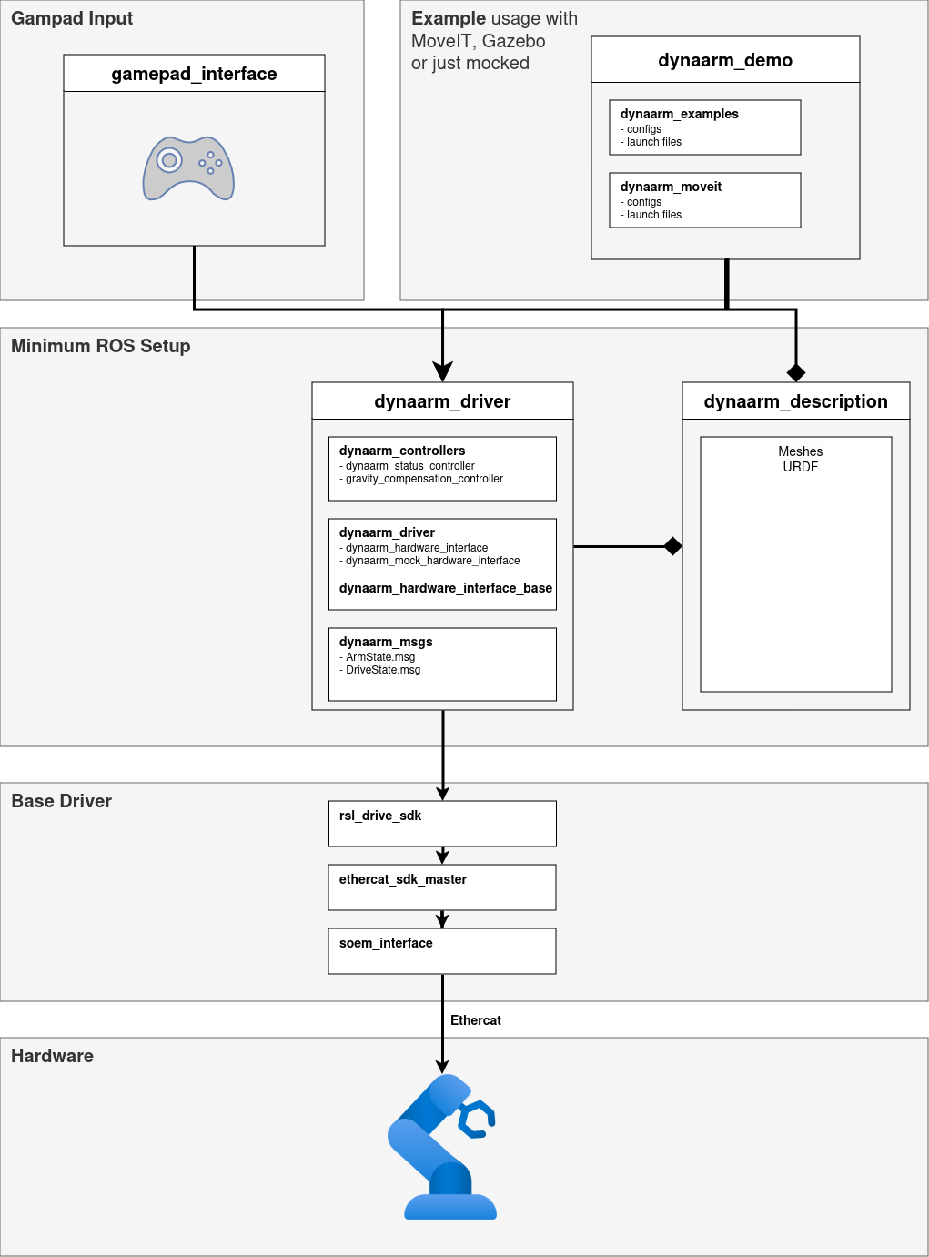 The DynaArm software is built on a modular ROS 2-based architecture, leveraging the following packages: